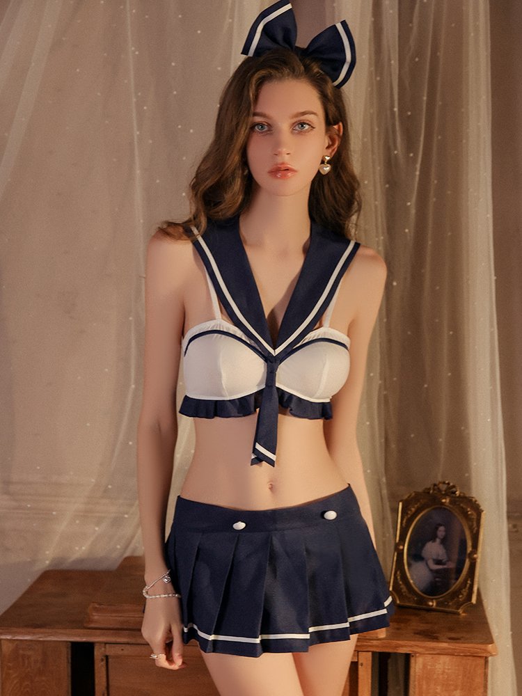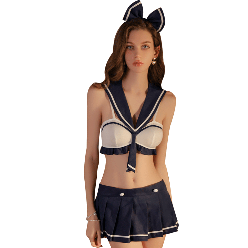 College style three-point short blouse with contrast color stitching on the neckline and a classic navy collar.