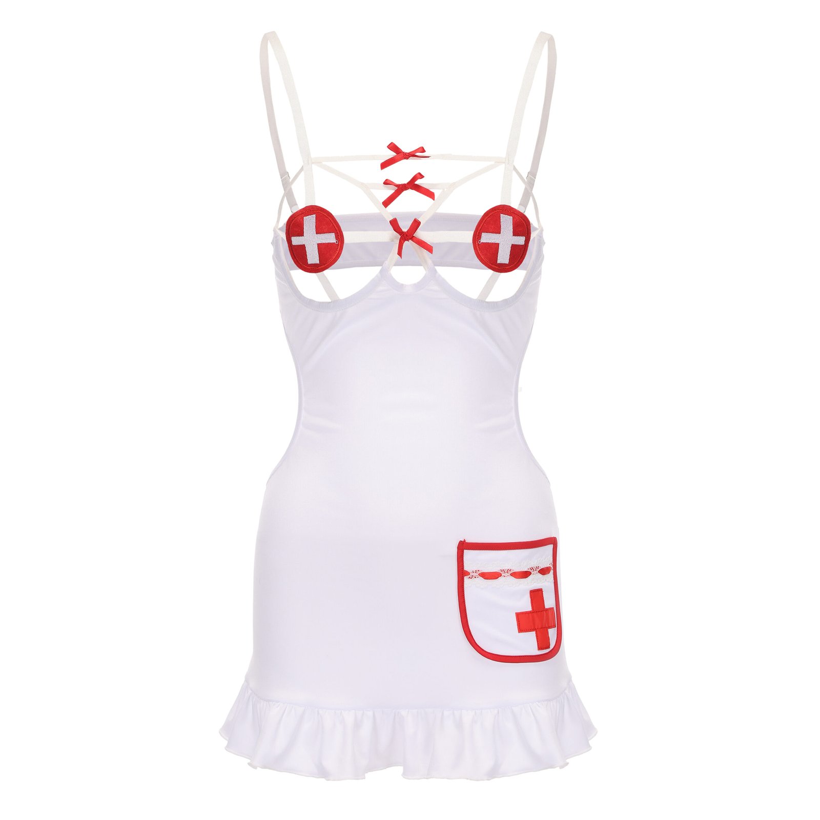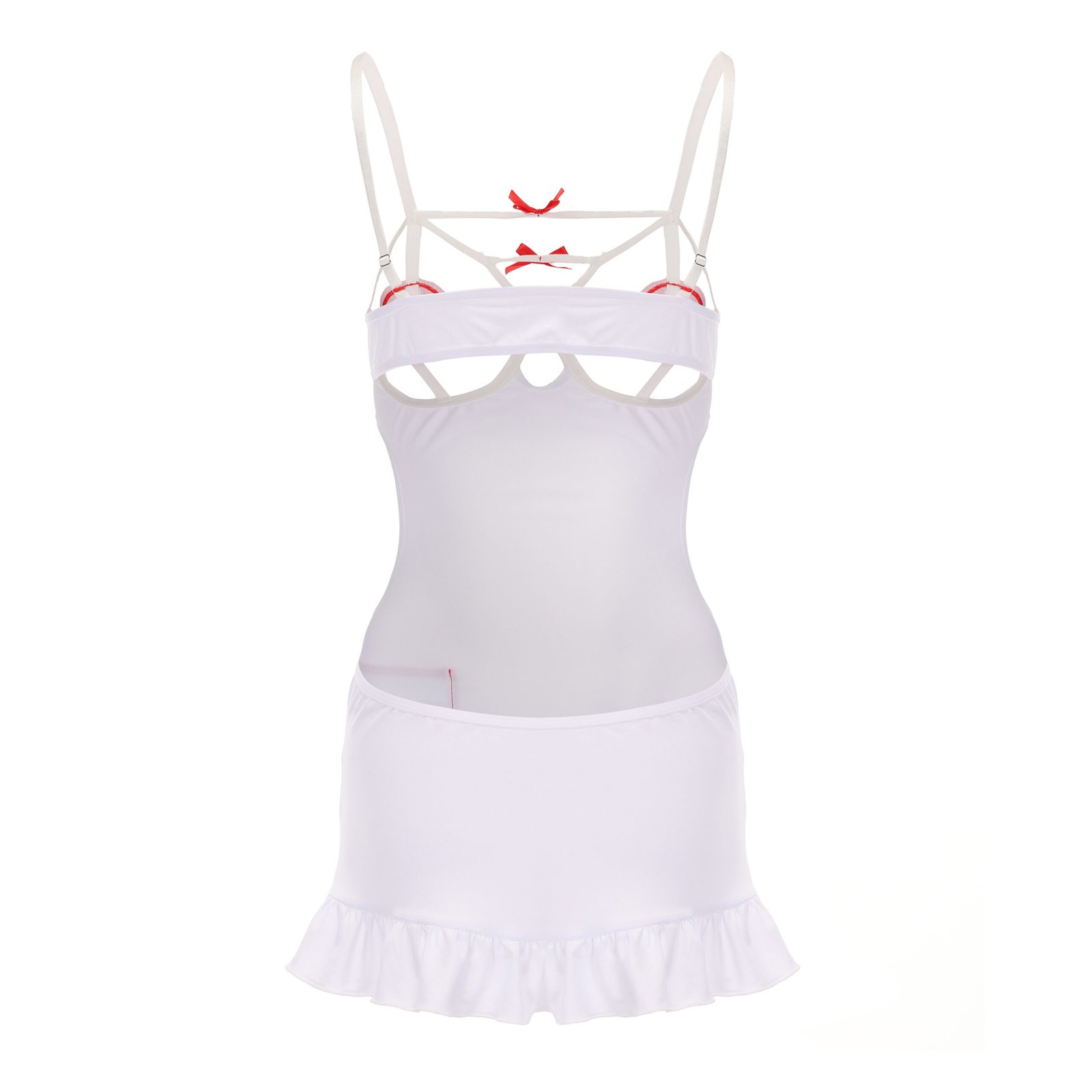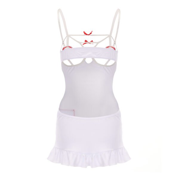 Tonight, become a lovely little nurse, ask the host to lie down obediently, take out the stethoscope and lean over to listen to the heartbeat of love. The cross element covers Xiaodoudou, and the thin band outlines the entire crisp chest, which is very tempting to tease his heart., Hollow style, sentimental back, cute little spray skirt and decorative pockets add color to the long night, and start a healing journey of love.