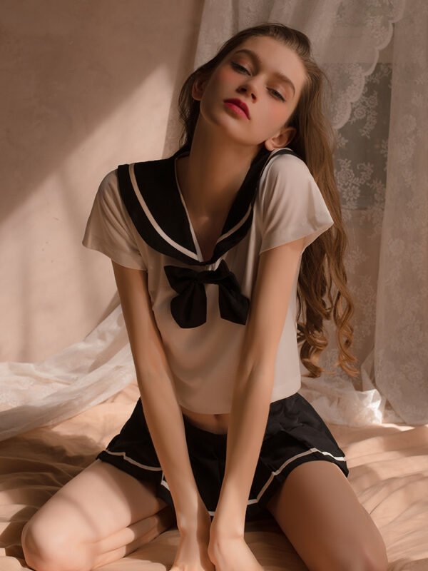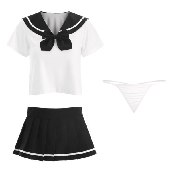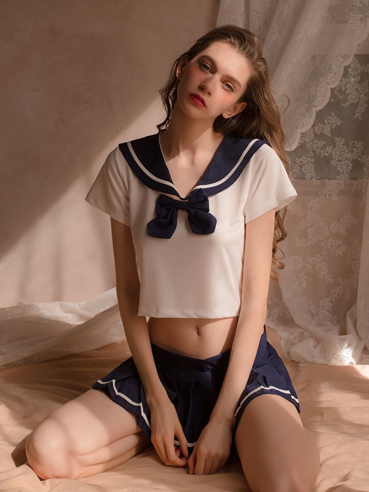 Classic student uniform, classic navy collar, bow embellishment, playful and sweet, temptation pleated skirt, waist velcro foldable, sexy T-pants.