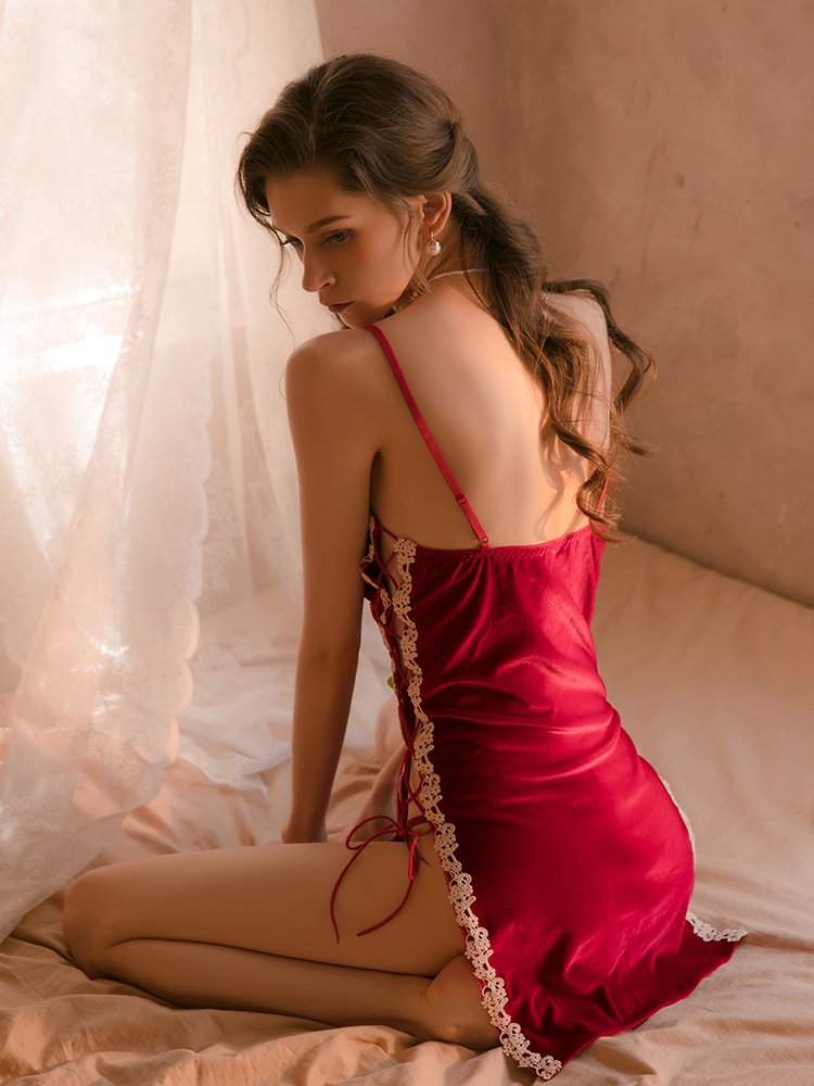 The salty and sweet velvet French sling nightdress has exquisite water-soluble flower trim, the charm is contented and highlights the charming clavicle, and the seductive fragrance is exuded when the breasts are slightly exposed. The design of the diagonal straps on the sides are all small details that cannot be ignored, subverting the stuffy air you carefully hide in the tuck., The back is half-cut backless, giving you a sense of comfort with zero restraint, and the overall sense of layering and high-level are displayed to the fullest.